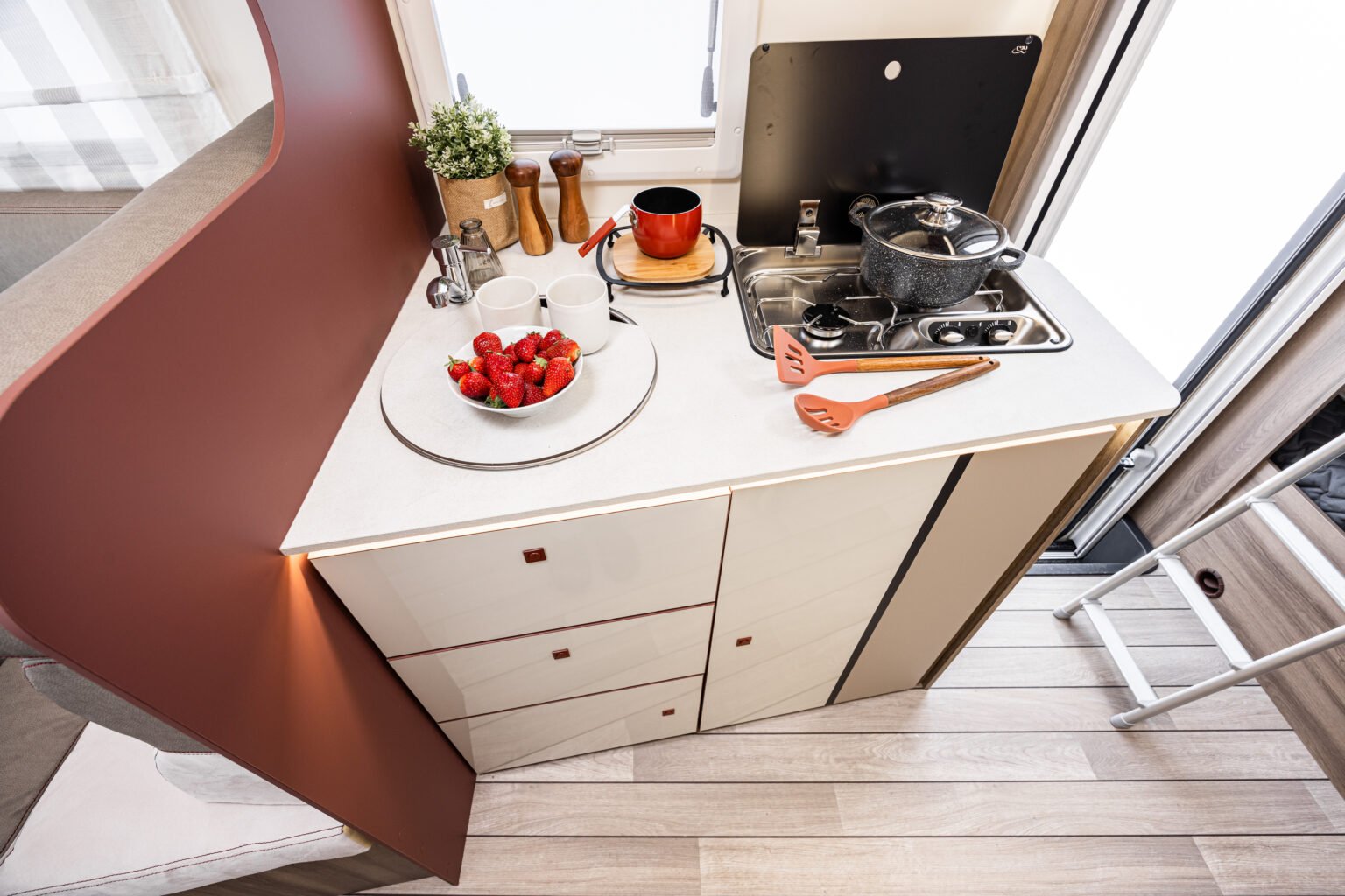 La cucina dei Kronos dispone di un piano cottura a 2 fuochi con copertura in vetro temperato che può essere abbassata per fornire ulteriore spazio di lavoro quando non viene utilizzato e di un pannello in metacrilato a protezione della finestra molto semplice da pulire.