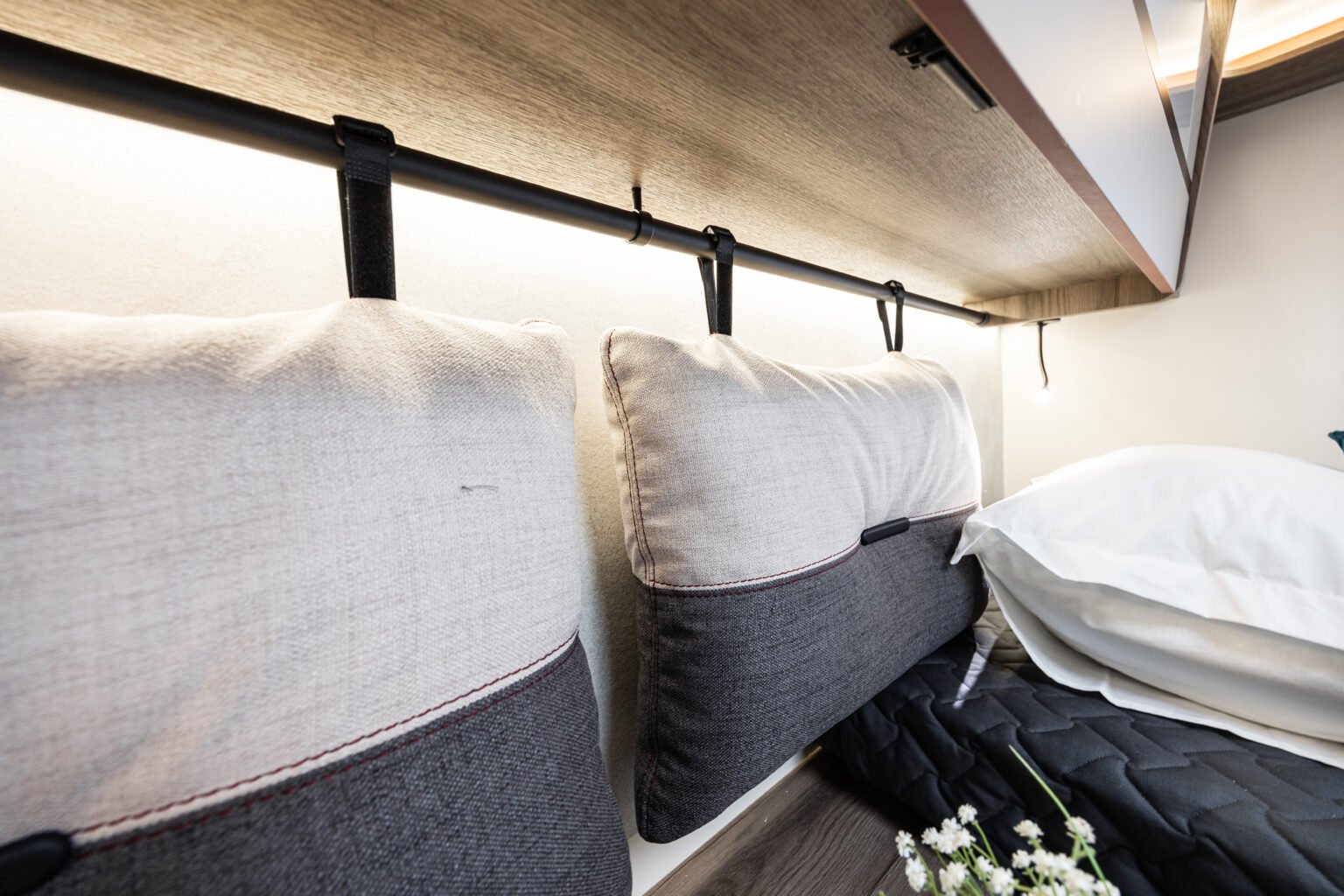 I camper Kronos offrono diverse soluzioni per la zona notte, adattandosi alle esigenze di ogni viaggiatore. Le configurazioni includono letti gemelli posteriori trasformabili in un ampio letto matrimoniale, letti trasversali sopra il garage o maxi letto matrimoniale centrale 190×150 cm. L’ambiente dispone di armadi spaziosi, posti sotto i letti o lateralmente, oltre a pensili sopra la testata del letto per riporre vestiti e altri oggetti personali. A creare un ambiente confortevole, luci di cortesia notturne perimetrali a pavimento e luci di lettura a led orientabili. Per la privacy una tenda plissettata, a seconda dei modelli, separa la zona giorno dalla zona notte.
