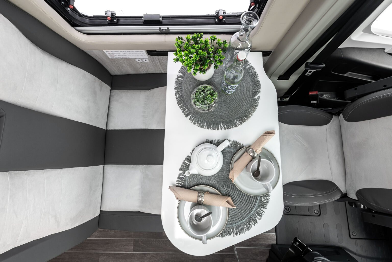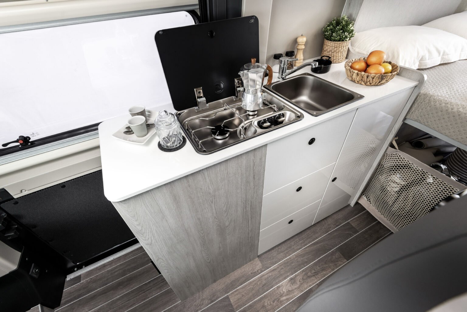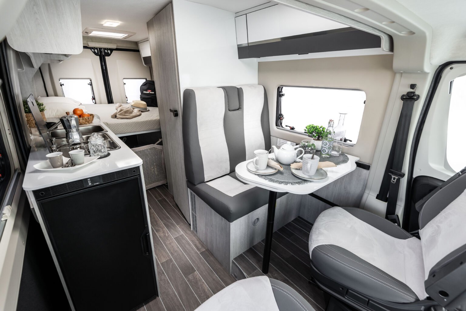 Sedili dinette con schienale ergonomico per un maggiore comfort. Bagno compatto con doccia integrata e lavabo a scomparsa. Letto matrimoniale trasversale con rete a doghe.